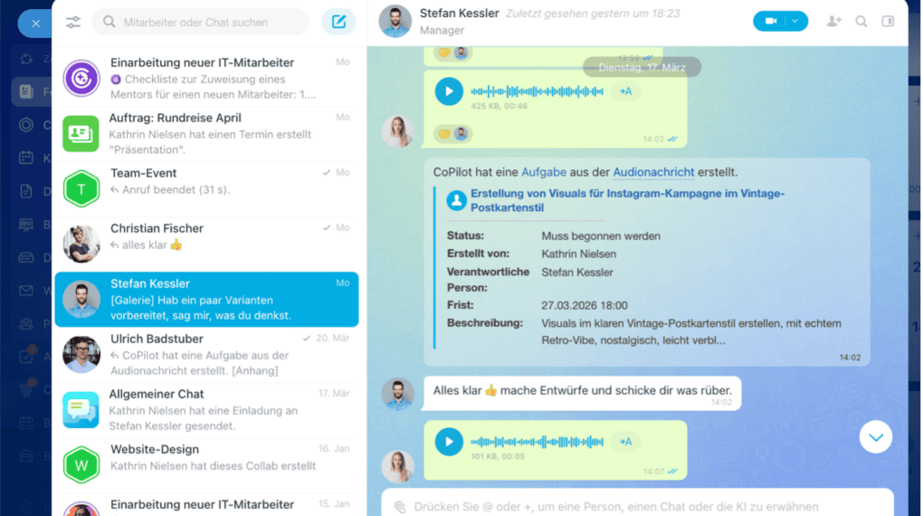 Chat, Videokonferenzen und Kommentare direkt in Aufgaben integriert